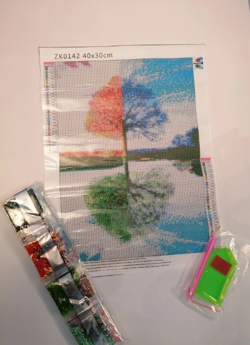Komplekt sisaldab: pilt-skeem, kus on kohad tähtedega, kuhu on vaja teemante panna (igale numbrile sobib oma värv); värvilised teemandid; aplikaator, konteiner.