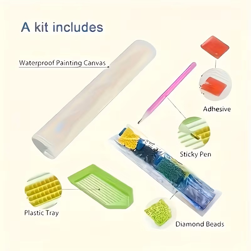 Komplekt sisaldab: pilt-skeem, kus on kohad tähtedega, kuhu on vaja teemante panna (igale numbrile sobib oma värv); värvilised teemandid; aplikaator, konteiner.